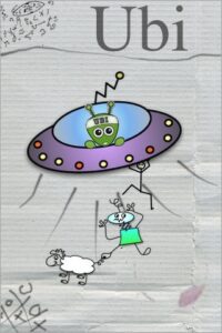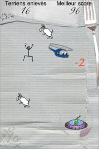 Les graphismes d’Ubi sont frais et mignons : dessinés à la main sur un coin de nappe en papier (d’où la présence d’une fourchette à l’écran ;) ). Ubi est sympathique pour un alien désirant enlever des humains et les personnages sont rigolos.