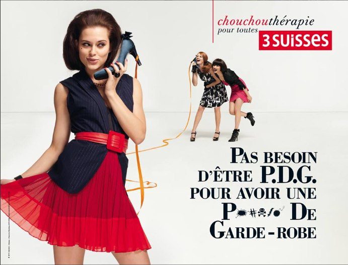 Avec des slogans du style « Notre point G, il est dans la penderie ! » ou encore « Liberté, Egalité, Mode pour toutes ! », Les 3 Suisses colle parfaitement à l’actualité et apporte un brin d’humour pince-sans-rire et quelque peu provocateur.
