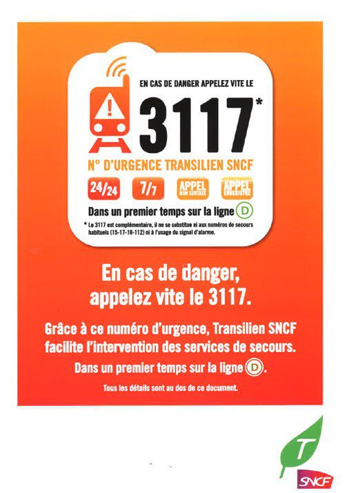 3117, vous l’avez peut-être déjà vu dans les gares ou dans vos journaux préférés, c’est le nouveau numéro d’urgence du réseau transilien de la SNCF. Testé depuis juin 2010 sur la ligne D du RER, le numéro 3117 vient d’être généralisé à l’ensemble des lignes du réseau Transilien.