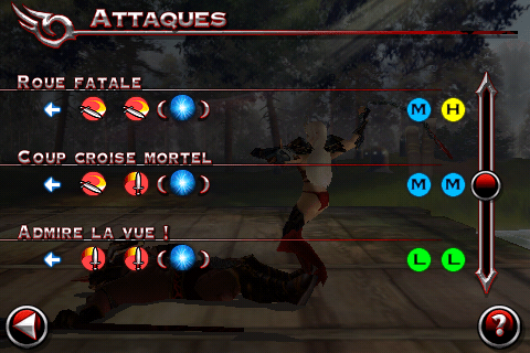 Un menu en combat permet d’avoir une liste des combos et attaques que votre personnage possède et la combinaison de touches associée pour l’exécuter. Très pratique au début, on l’oubliera par la suite, certaines techniques étant vraiment dur à exécuter et à placer dans le combat.