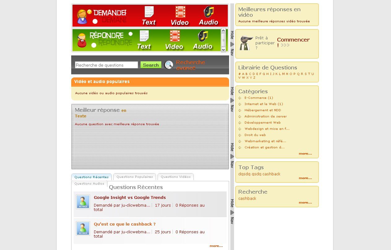 Passons maintenant aux fonctionnalités. La première, Q – Réponses (pour Questions / Réponses bien entendu), est un espace dans lequel s’échangent des questions et des réponses entre professionnels (ou pas ?) d’internet. Chaque membre est libre de poser une question ou de répondre aux questions des autres. Les questions et les réponses peuvent être évaluées, et le membre se voit attribuer des points en fonctions du jugement des autres. Un système de grade en fonction du nombre de points semble être présent. Les questions – réponses peuvent être posées sous la forme de texte, de vidéos ou de sons.
