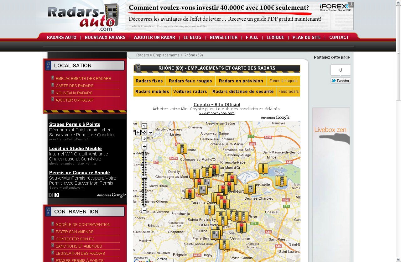 Le site Radars-auto.com propose une carte de l'emplacement des radars automatiques dans votre département. Que ce soit un radar fixe, mobile, de feu rouge ou en prévision, vous pouvez le trouver facilement grâce à une carte Google Maps sur laquelle sont indiquées ces équipements sournois de contrôle de vitesse.