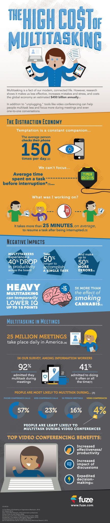 Une infographie réalisée par le site Fuzz montre quelques statistiques pour le moins inquiétante. La plus inquiétante étant que le multitâche peut réduire le QI de 15, soit 3 fois plus que la consommation de cannabis. Ça craint ça !