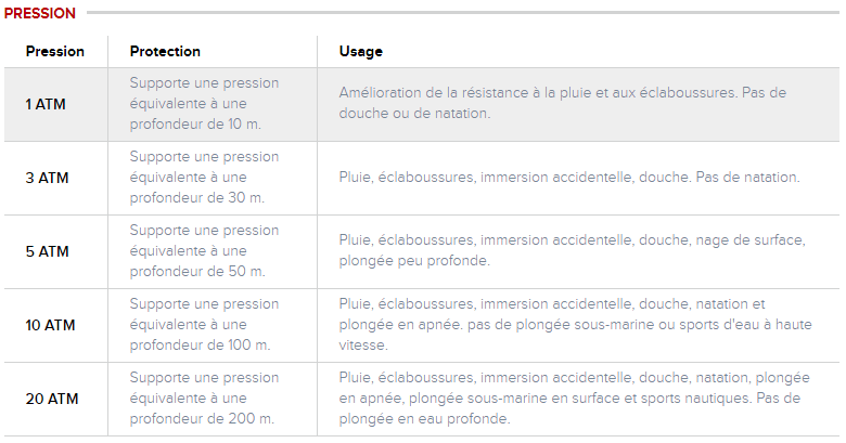 A savoir : si 5 ATM correspondent à une certaine profondeur, celle-ci est mesurée avec une pression statique. Or, la pression de l’eau peut varier très rapidement, comme lorsque l’on bouge le bras en nageant. Vous aurez beau évoluer dans seulement 3 mètres d’eau, la pression créée par les mouvements de votre bras peut être équivalente à 2 ATM. Il vaut mieux se référer au manuel de votre appareil ou au site du constructeur afin de bien connaitre son produit, ses caractéristiques et ses limites, ainsi que ses différentes conditions d’utilisation (douche, natation, plongée sous-marine, etc …).