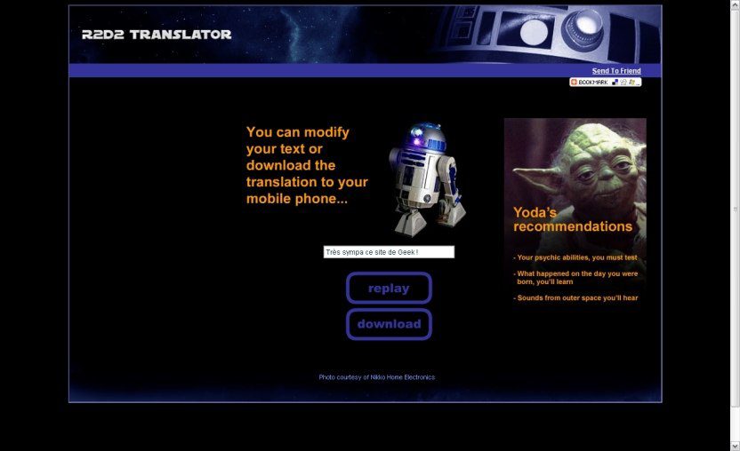 Avec le R2D2 Translator, vous allez pouvoir traduire n’importe quelle phrase que vous souhaitez transmettre à votre fidèle droïde, que ce soit pour qu’il aille vous chercher une bière fraîche ou sortir la pizza du four tout en la découpant. D’une utilité réelle quasi inexistante mais d’une futilité complétement réelle, ce traducteur R2D2 convertit n’importe quelle phrase saisie en une succession de gazouillis et de bip électroniques dignes de la plus belle prose d’un des droïdes les plus célèbres du cinéma.Non seulement la traduction est sonore, mais elle est aussi visuelle par l’affichage d’une succession de symboles euh … alien ? … au fil de la lecture de votre traduction droïdienne, à la manière d’un karaoké.