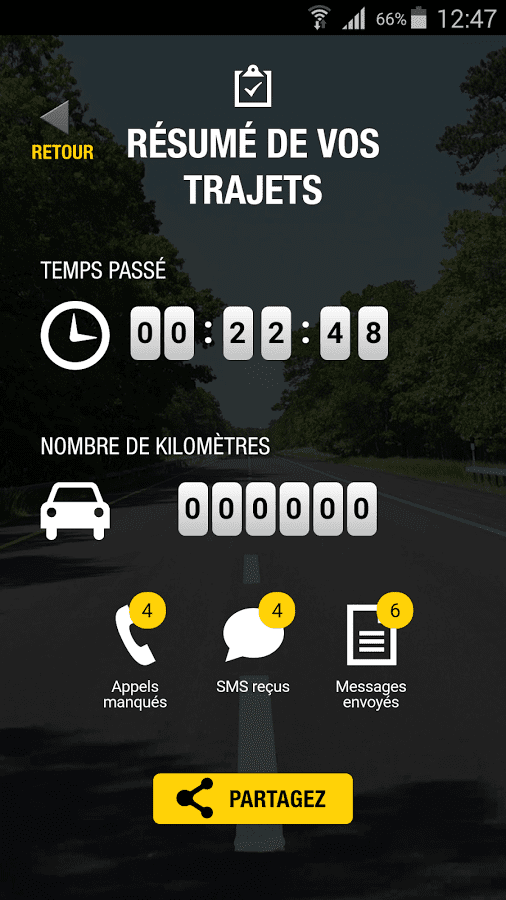 A la fin de votre trajet, vous désactivez Mode Conduite et l’application affiche un récapitulatif du nombre d’appels et de sms qui ont été interceptés, ainsi que le nombre de kilomètres parcourus de manière sereine. Le tout avec la possibilité de partager ce résultats sur vos réseaux sociaux favoris.