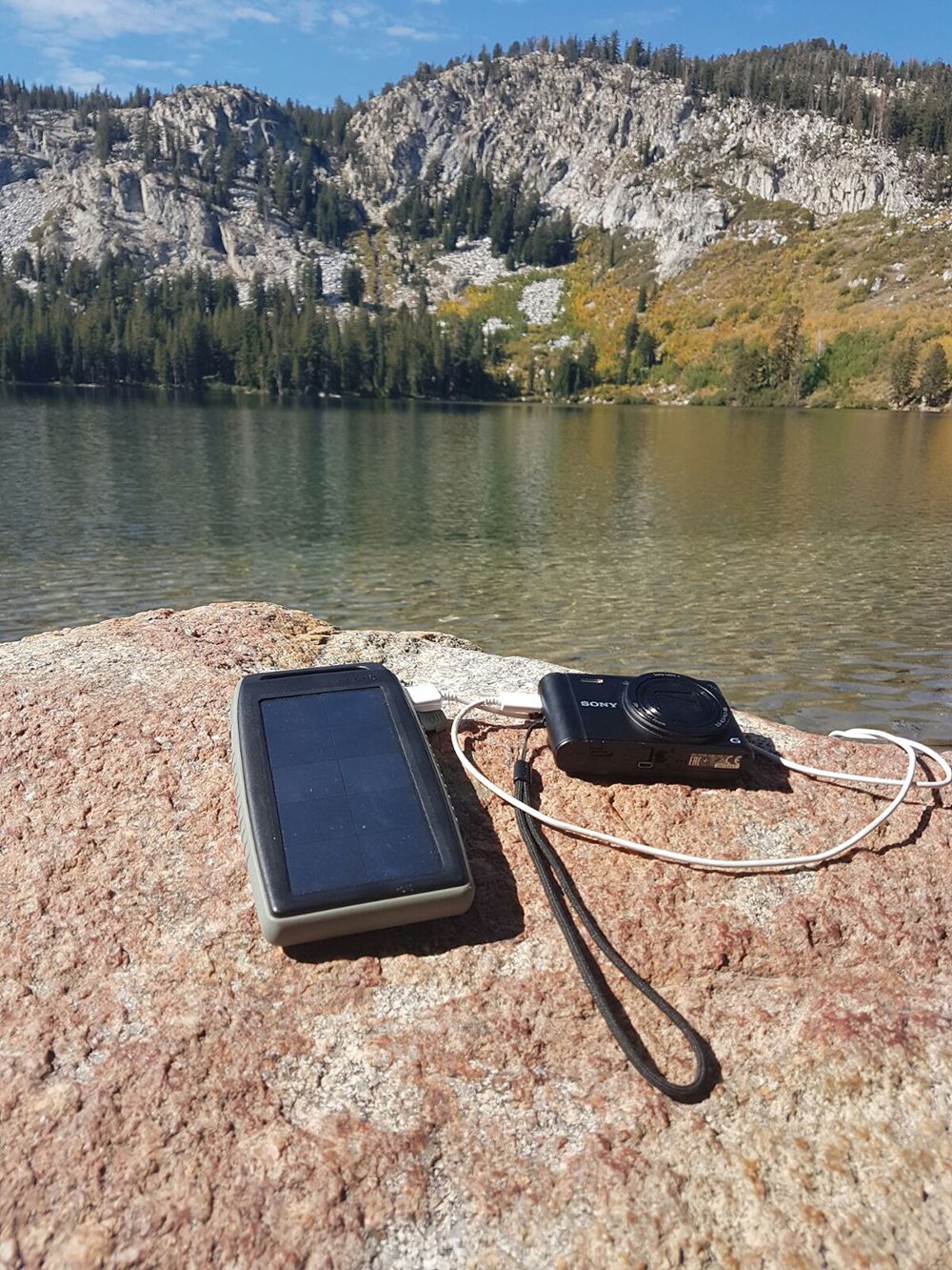 La capacité de la batterie Hybrid Solar Bank est de 10000 mAh, ce qui permet de recharger un smartphone environ 4,5 fois. La batterie interne se recharge par le port USB ou par la prise secteur (en utilisant un chargeur de portable non fourni par exemple), ou en utilisant le panneau solaire. Ce panneau solaire SunPower® à haut rendement a été conçu pour assurer une recharge ultra-rapide via l’énergie solaire. Enfin, il ne faut quand même pas être pressé car, vu la capacité de la batterie (10000 mAh je vous le rappelle), cela prend déjà une bonne dizaine d’heures par USB, et 5 à 6 heures par secteur. Alors par panneau solaire, vous pouvez compter sur une bonne semaine avec un bon ensoleillement (plus si vous êtes en région parisienne comme moi). Mais en extérieur, pas besoin de soleil direct, la luminosité ambiante suffit déjà (s’il y a le soleil c’est encore mieux).