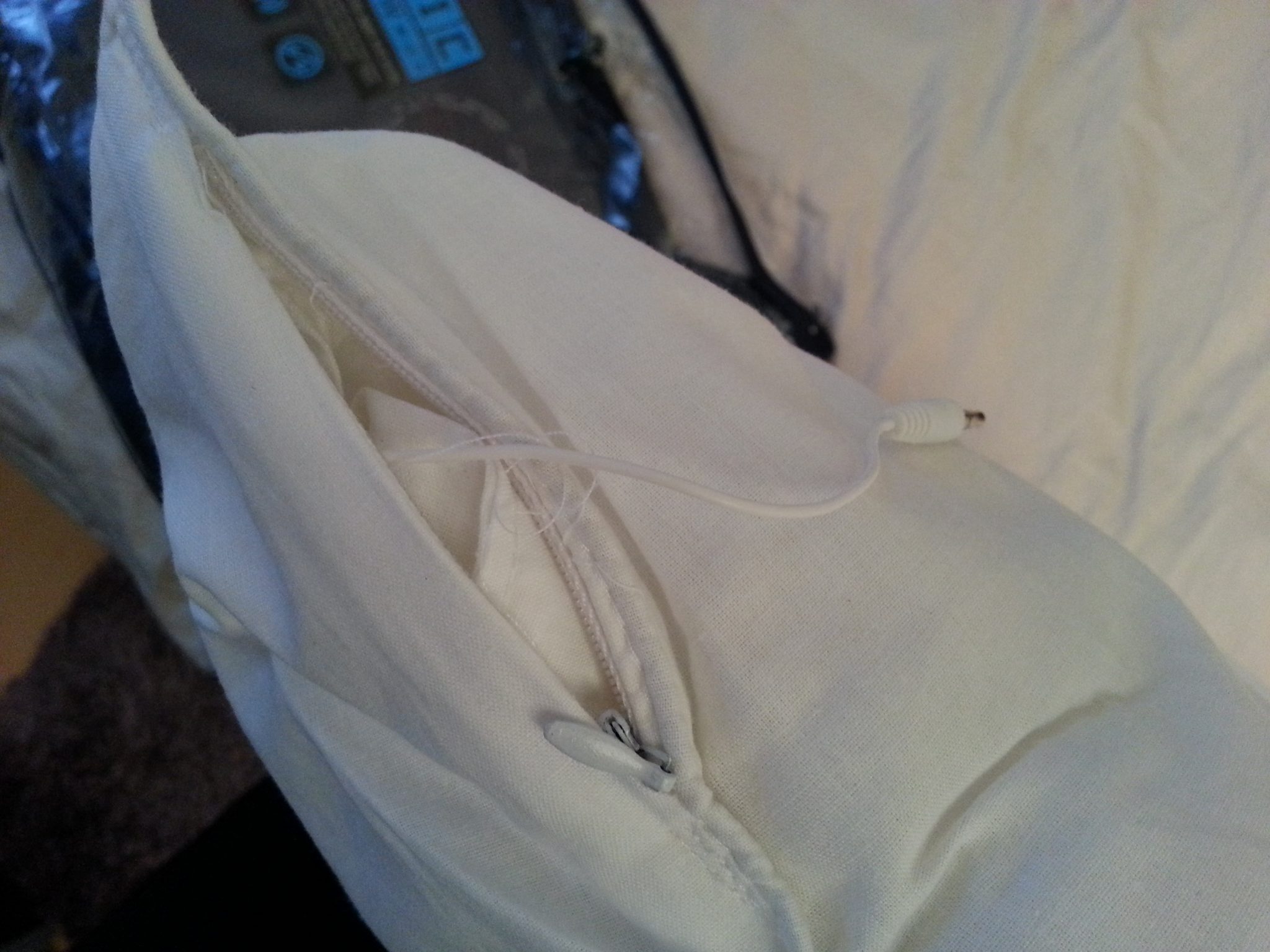 Il est très simple : un haut-parleur est intégré au sein même de l’oreiller et permet de diffuser le contenu sonore de votre smartphone, de votre baladeur numérique ou de tout autre appareil d’écoute musical via une prise jack. cette prise d’ailleurs, il m’a fallu 5 minutes pour la trouver, elle était bien cachée ! Dans un coin de l’oreiller, il y a une fermeture éclair qui, une fois ouverte, permet l’accès à un cordon jack d’une longueur approximative de 20 cm. Il vous suffit de le brancher à votre périphérique audio pour lire vos musiques. Le haut-parleur de l’oreiller est auto-alimenté par la prise jack, il n’y a pas de batterie dans l’oreiller, ce qui est très pratique.