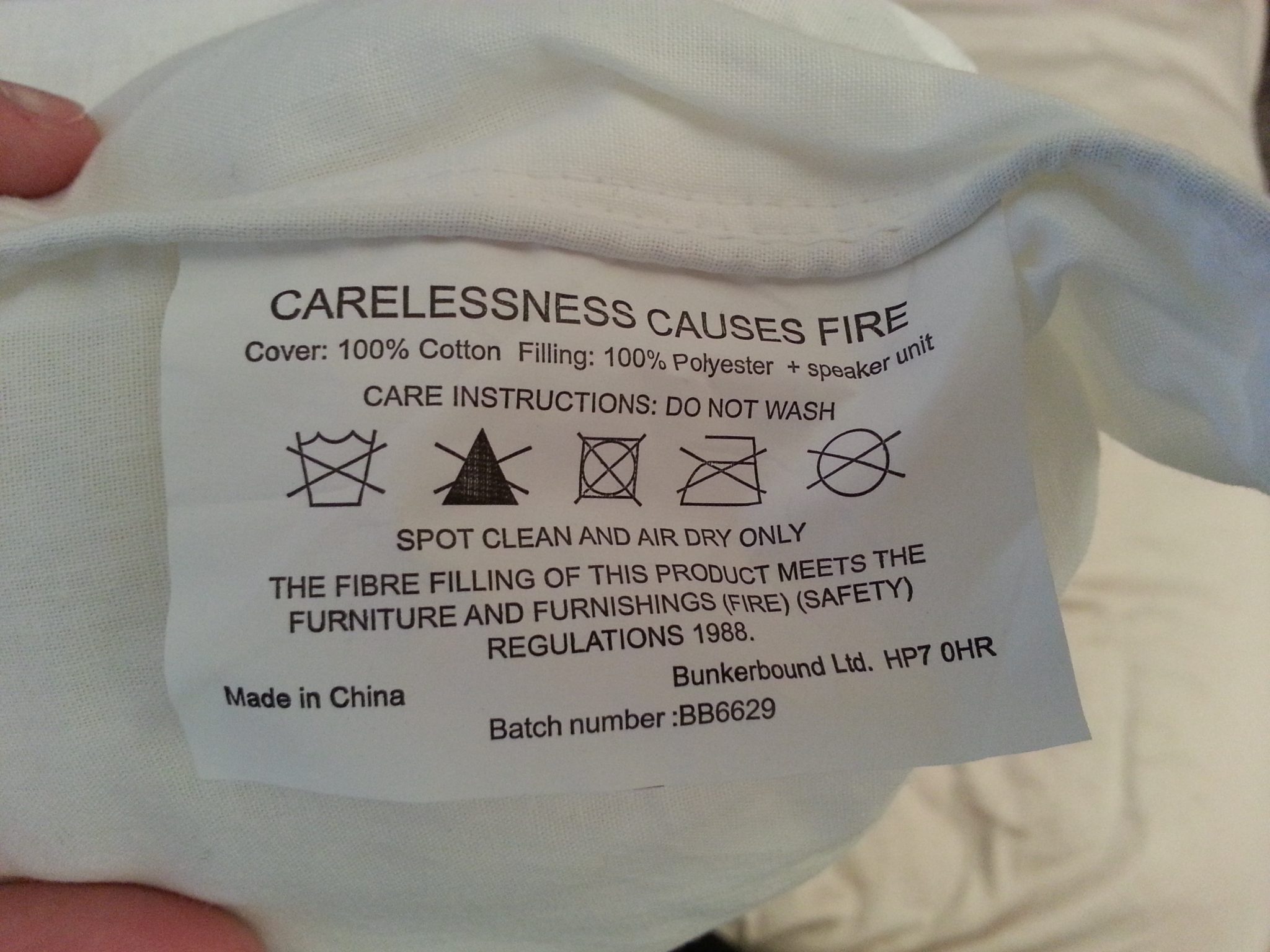 En gros, à part que la housse est en coton et l’intérieur en polyester, on y voit que l’oreiller n’est pas lavable. Il faut le passer au pressing pour un petit nettoyage à sec, bien que je ne sois pas sûr que les fils apprécient la chaleur et les produits détergents à sec.