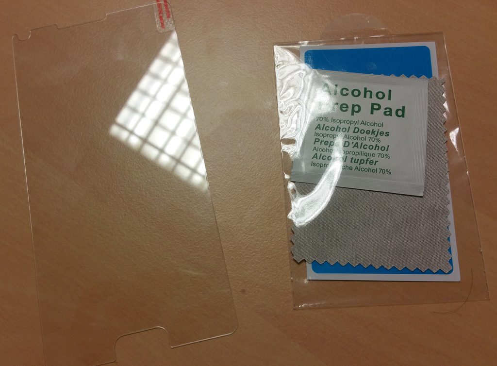 A l’intérieur, on retrouve la protection d’écran dans un étui de protection, ainsi qu’une lingette dégraissante permettant de nettoyer l’écran et de retirer les traces de doigts et de graisse préalablement à la pose de la protection d’écran. Egalement, il y a une lingette microfibre permettant de retirer les poussières de l’écran avant la pose, et aussi des adhésifs servant de guides à la pose de la protection d’écran.