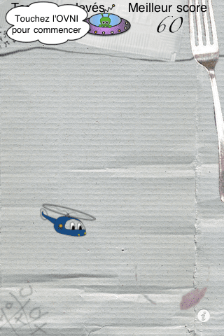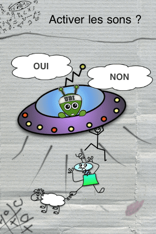 Les graphismes d’Ubi sont frais et mignons : dessinés à la main sur un coin de nappe en papier (d’où la présence d’une fourchette à l’écran ;) ). Ubi est sympathique pour un alien désirant enlever des humains et les personnages sont rigolos.