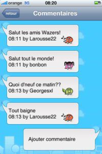 Waze réussit le pari d’introduire une dimension sociale et de jeu à un service GPS. Chaque « wazer » a ainsi la possibilité d’être visible en temps réel sur les cartes, grâce à un petit avatar personnalisable selon son humeur. Grâce à une fonction de « chit-chat », il a également la possibilité d’échanger en direct avec les autres « Wazers ».